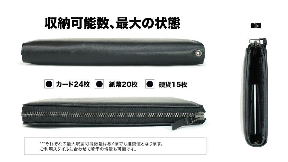 推奨収納数はカード24枚、紙幣20枚、硬貨10枚~15枚。