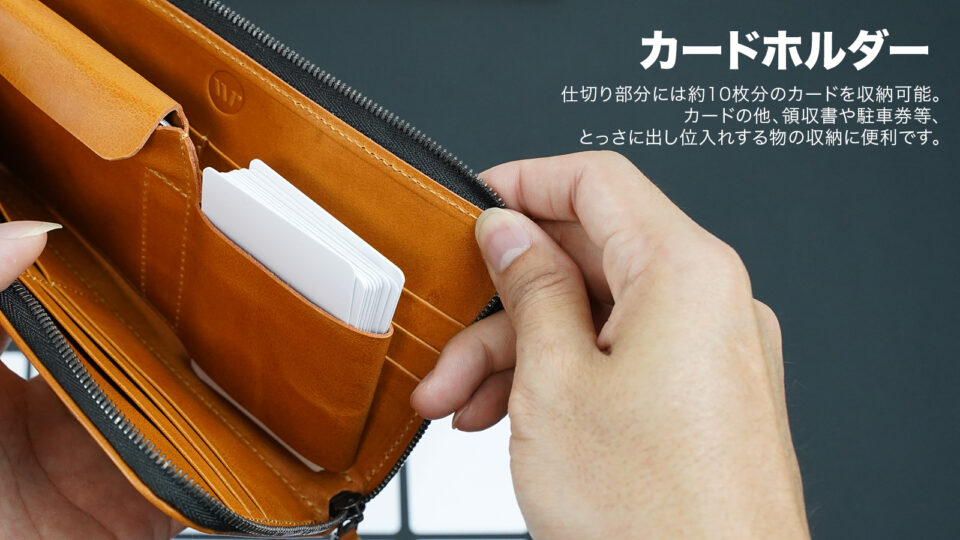 カード収納をポケットではなく纏めて入れるホルダータイプにし、重なりを少なくしたことでぎっしり入れた状態での厚ぼったさを軽減しました。